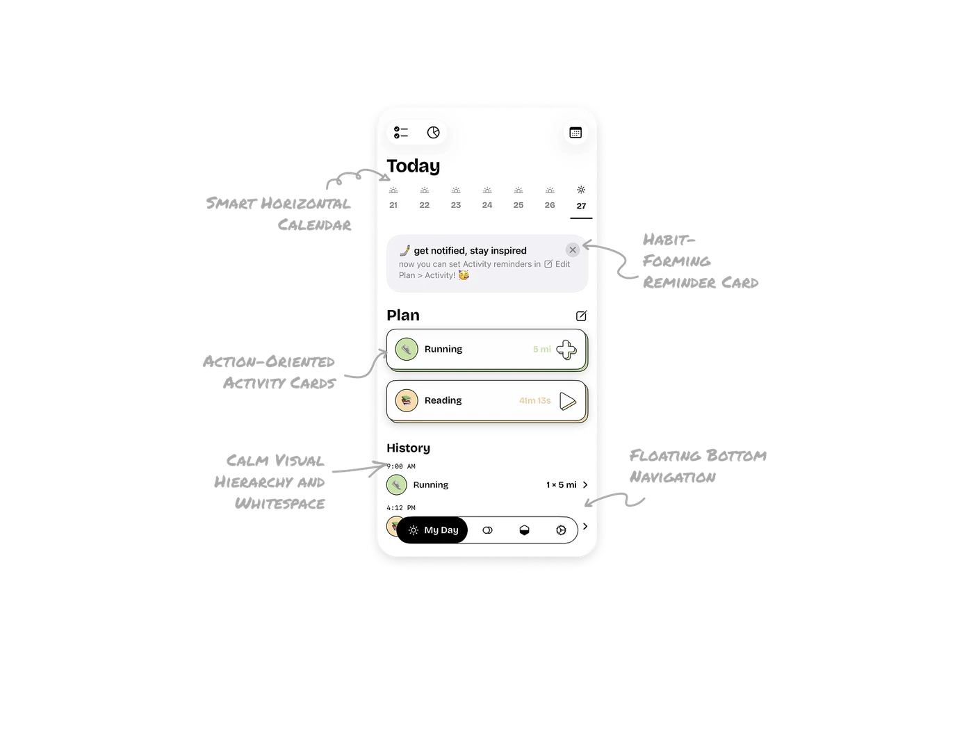 The compact horizontal calendar saves space while keeping the layout clean. Clear visual hierarchy makes today’s date stand out with full-sun icons and darker contrast, while past dates fade subtly, a simple yet effective distinction.
