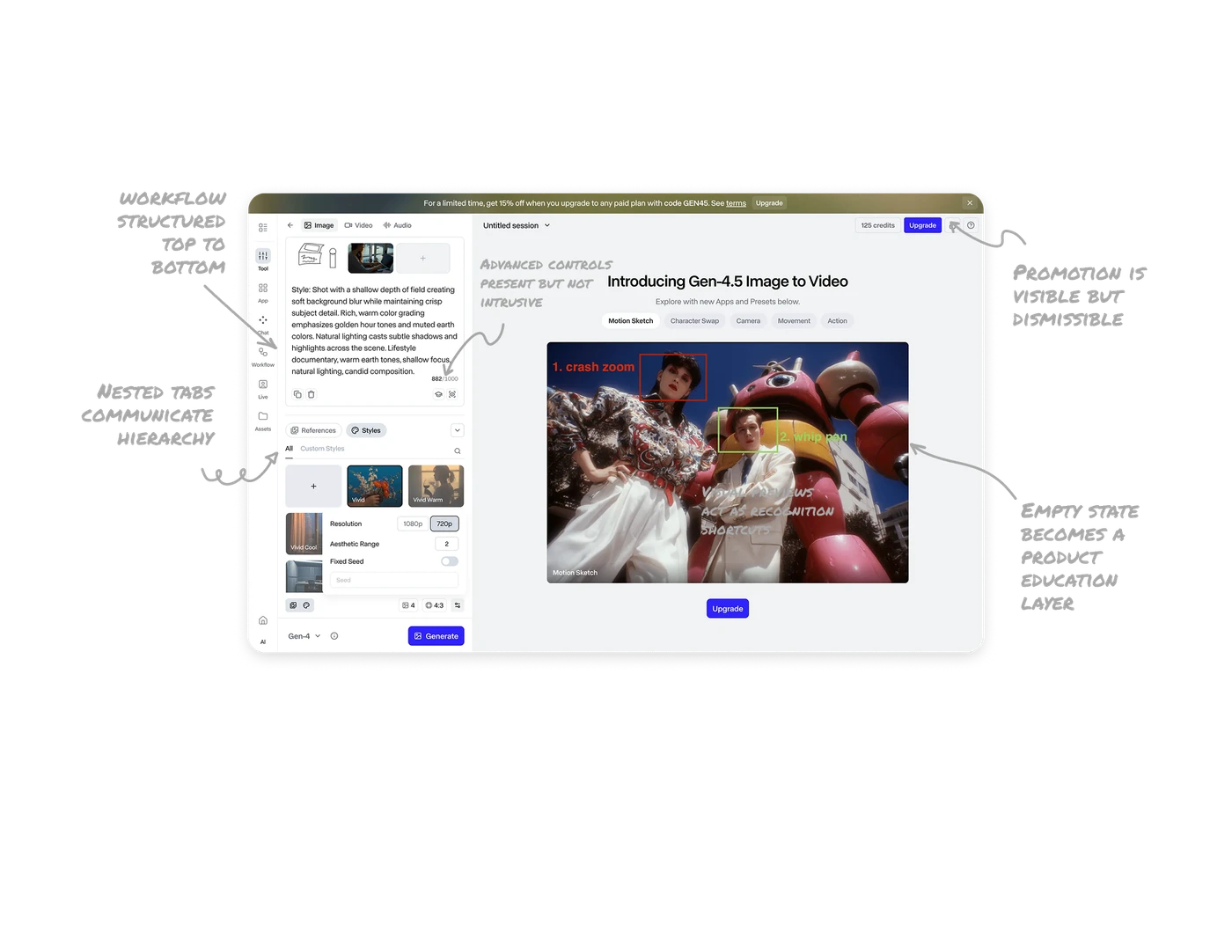 Before generation, the canvas highlights new features like Gen 4.5 Image to Video along with an Upgrade CTA. Instead of leaving the space blank, the product uses idle time to educate and promote. Empty states can drive discovery and conversion at the same time.