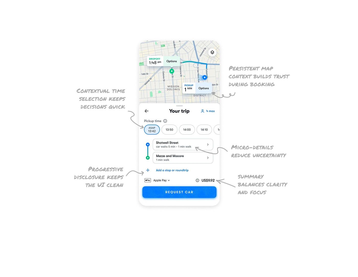 The UI adds clarity by displaying supporting details like how long the car will wait and the walking distance to the pickup. These small context cues help users prepare and feel in control before confirming the trip.