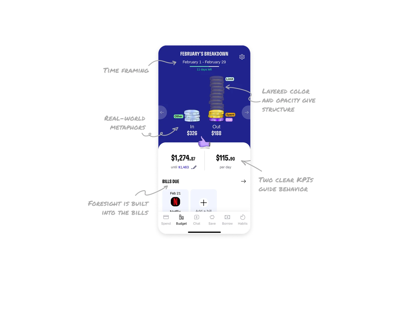 The out stack isn’t just decorative. The colors and shading map directly to limit, spent, and due amounts. This lets users decode three different states at a glance without reading a single label. It’s a visual hierarchy done with personality.