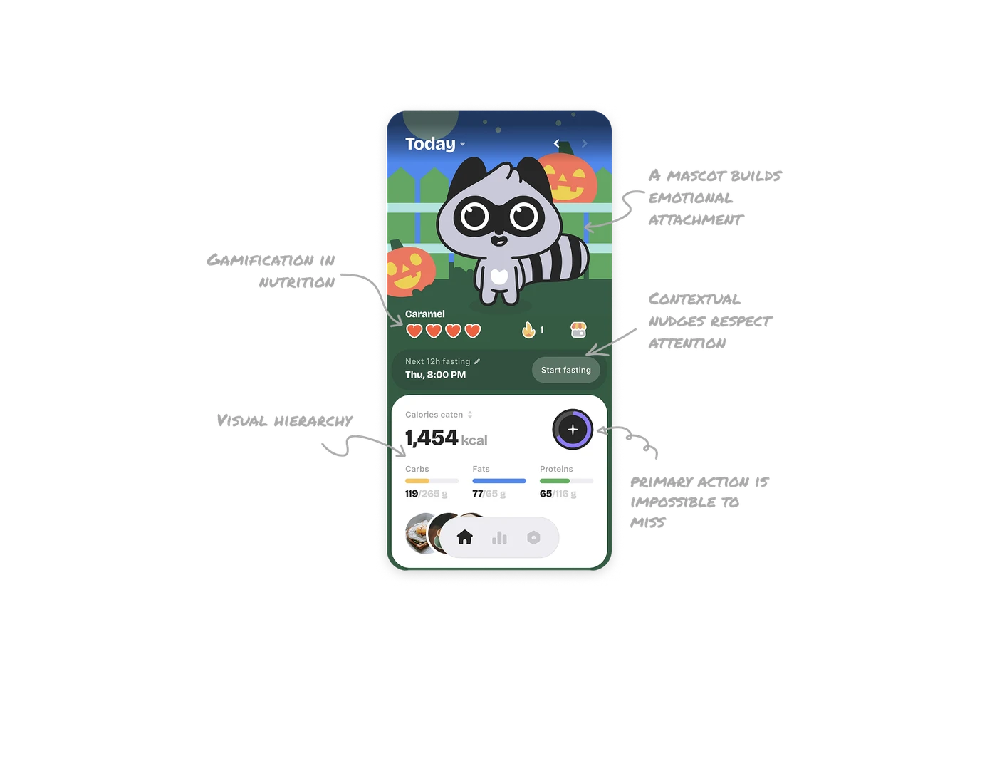 The raccoon mascot is not decorative. It creates a sense of companionship and accountability. Users are not just tracking calories; they are taking care of Caramel. Seasonal backgrounds reinforce this emotional layer and make the app feel alive instead of static.