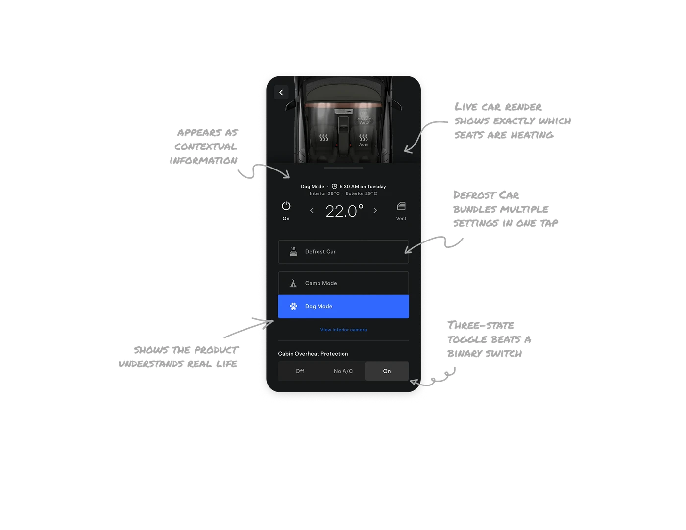 Camp Mode and Dog Mode exist because Tesla designers recognized actual user situations that a standard climate UI would ignore. View Interior Camera next to Dog Mode lets owners check on their pet remotely. Features built from empathy with specific real-world scenarios create deeper emotional connection than any generic "feature" ever could. This is contextual design that earns lifelong users.