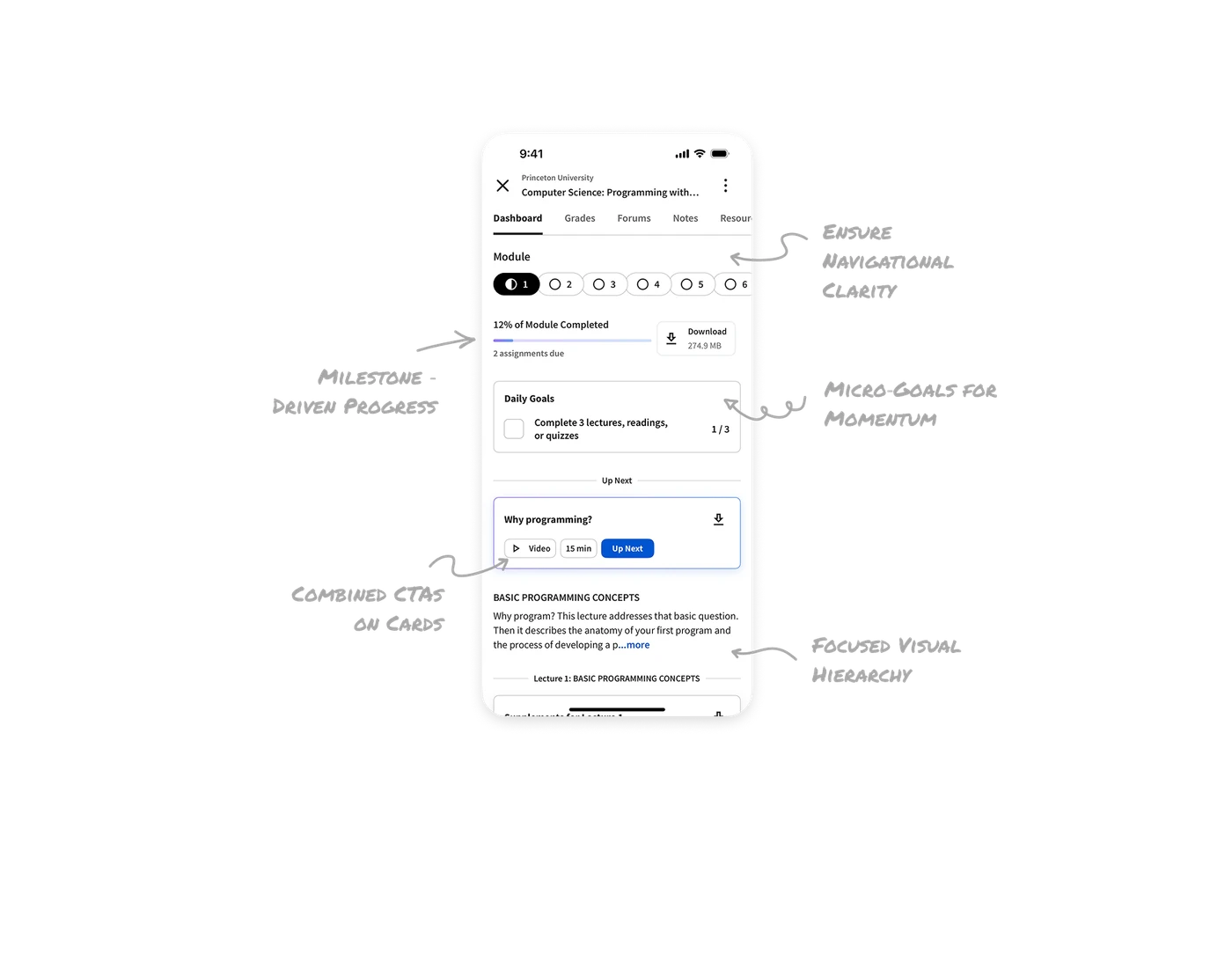 Typography, spacing, card layout, and icons create a clear structure, making dense educational content easy to scan and prioritize.