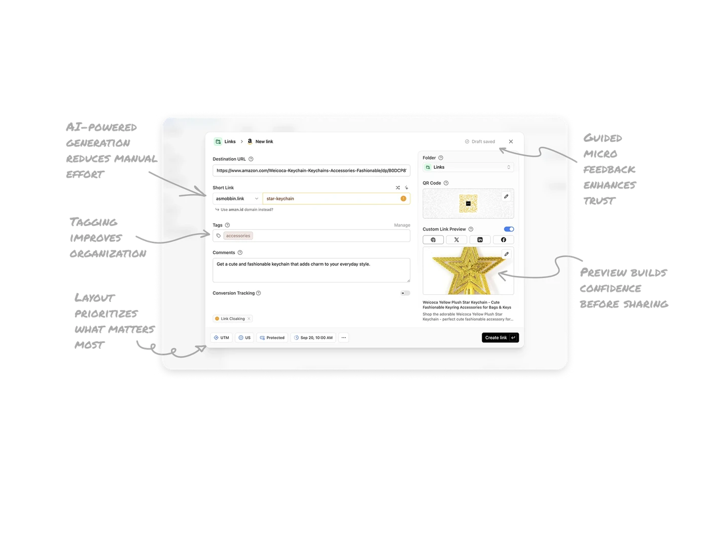 The short link field offers a random URL and AI suggestions, enabling users to create meaningful short links in seconds. Domain switch suggestions, such as “amzn.id,” also help build trust with contextually relevant URLs.