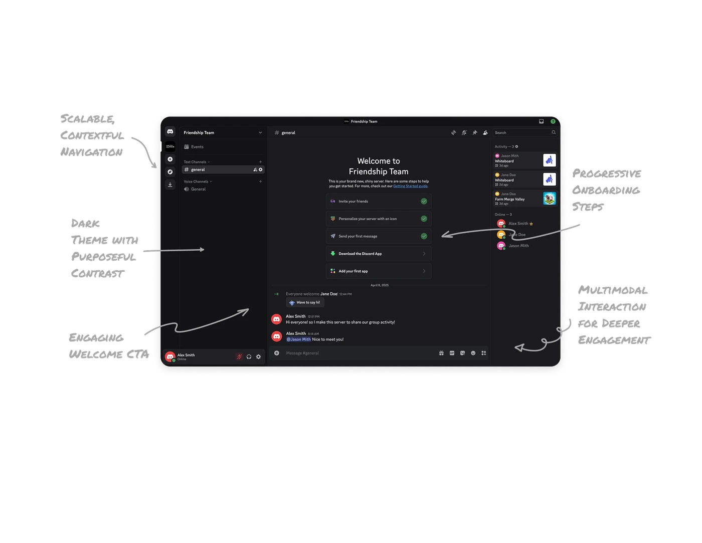 The layout supports multiple ways to interact, including text chat, voice channels, app integrations, and the activity feed. This allows for deeper engagement while keeping the experience approachable.
