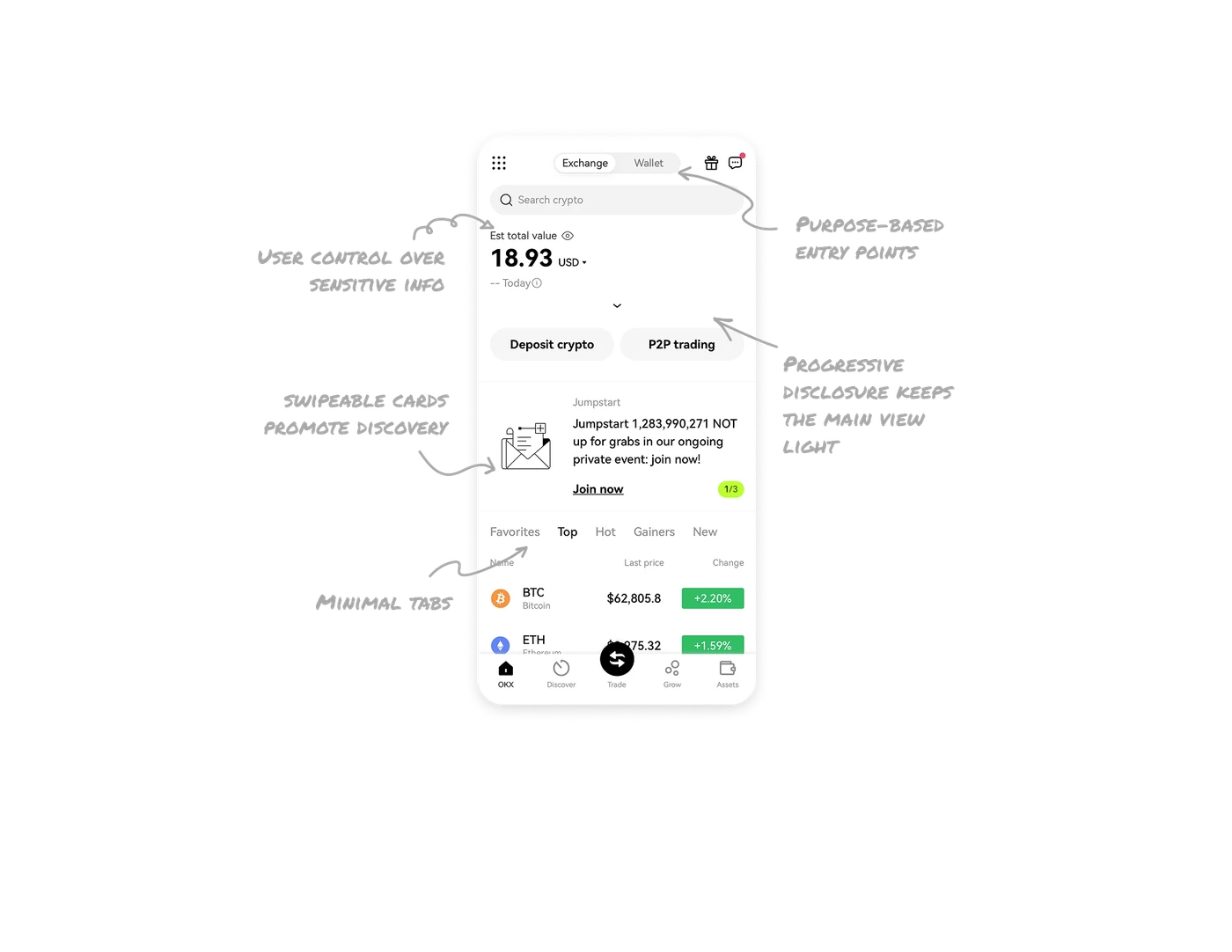 The Exchange and Wallet tabs sit right at the top, letting users choose their intent before engaging with content. Trading and asset management stay clearly separated, which prevents mental switching and confusion.