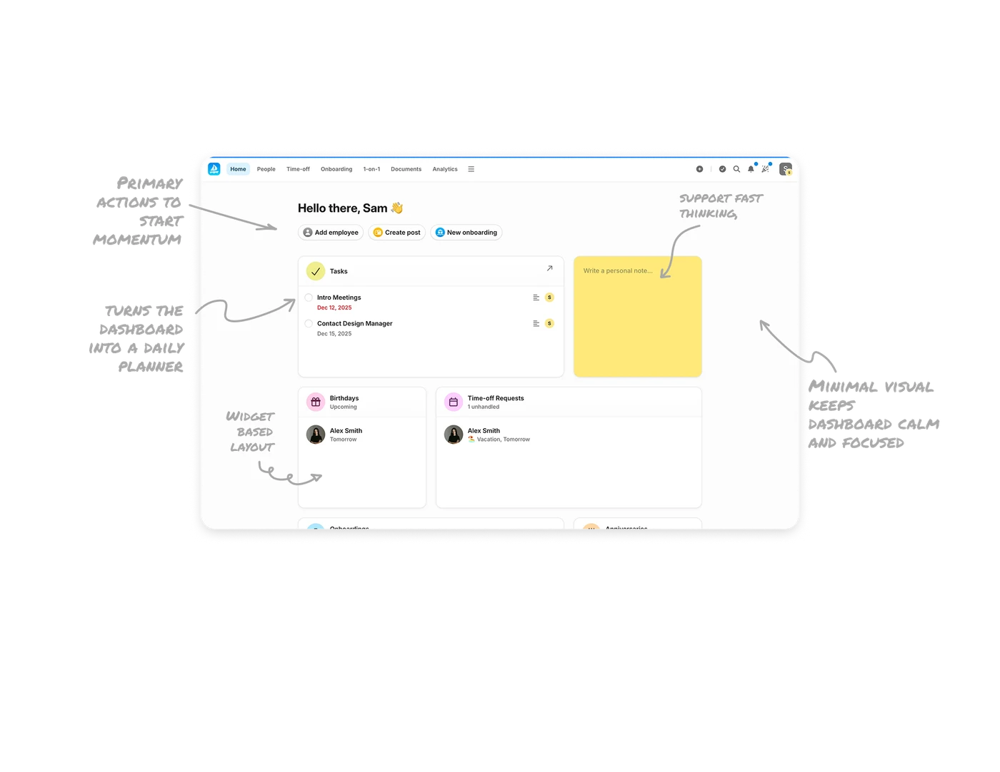 Each card is dedicated to a single purpose like tasks, birthdays, time-off. This creates predictable zones and makes scanning effortless. Users learn where to look for what, which builds speed and confidence over time.