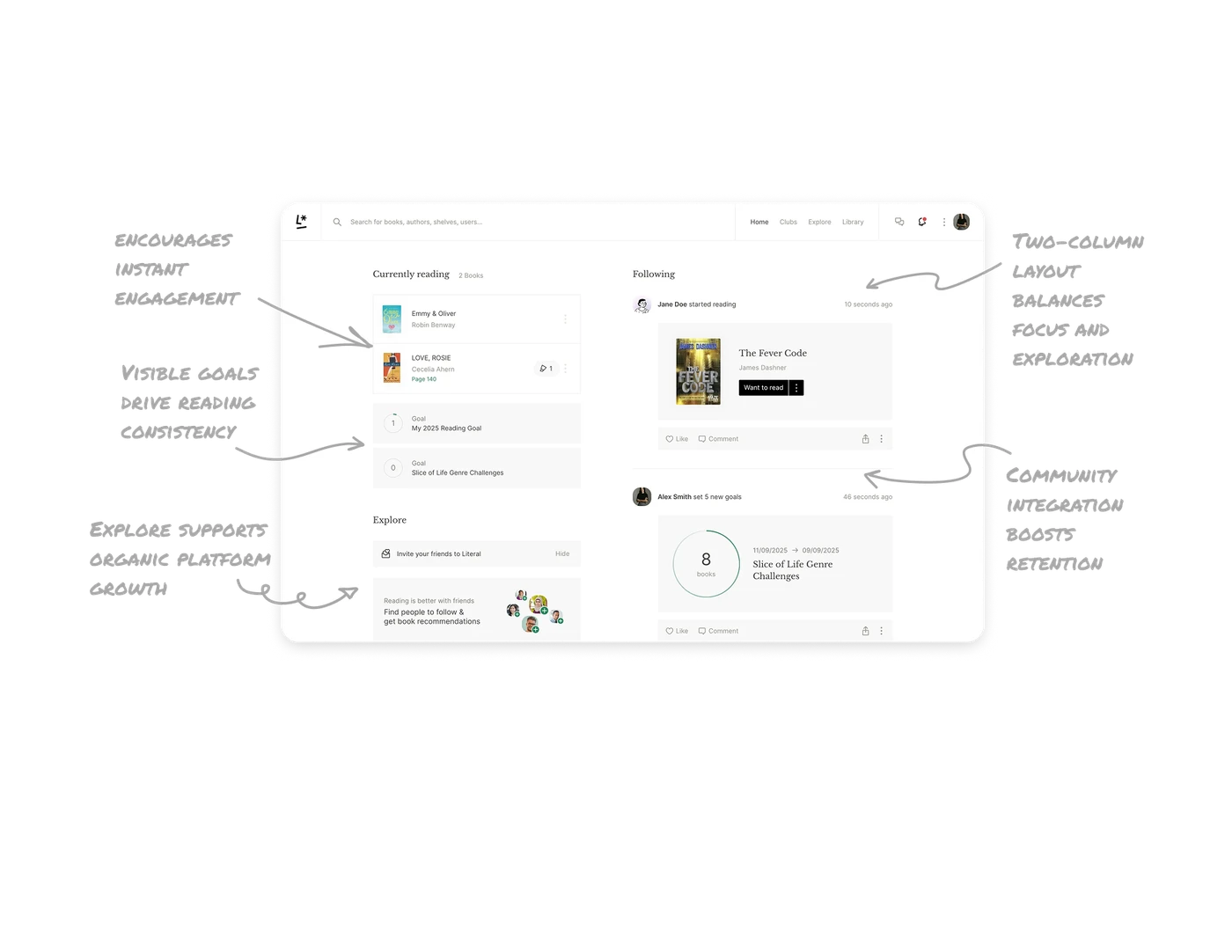 The “Following” feed transforms reading into a shared experience. Seeing updates from friends adds social proof and creates a sense of belonging, reducing user drop-off.