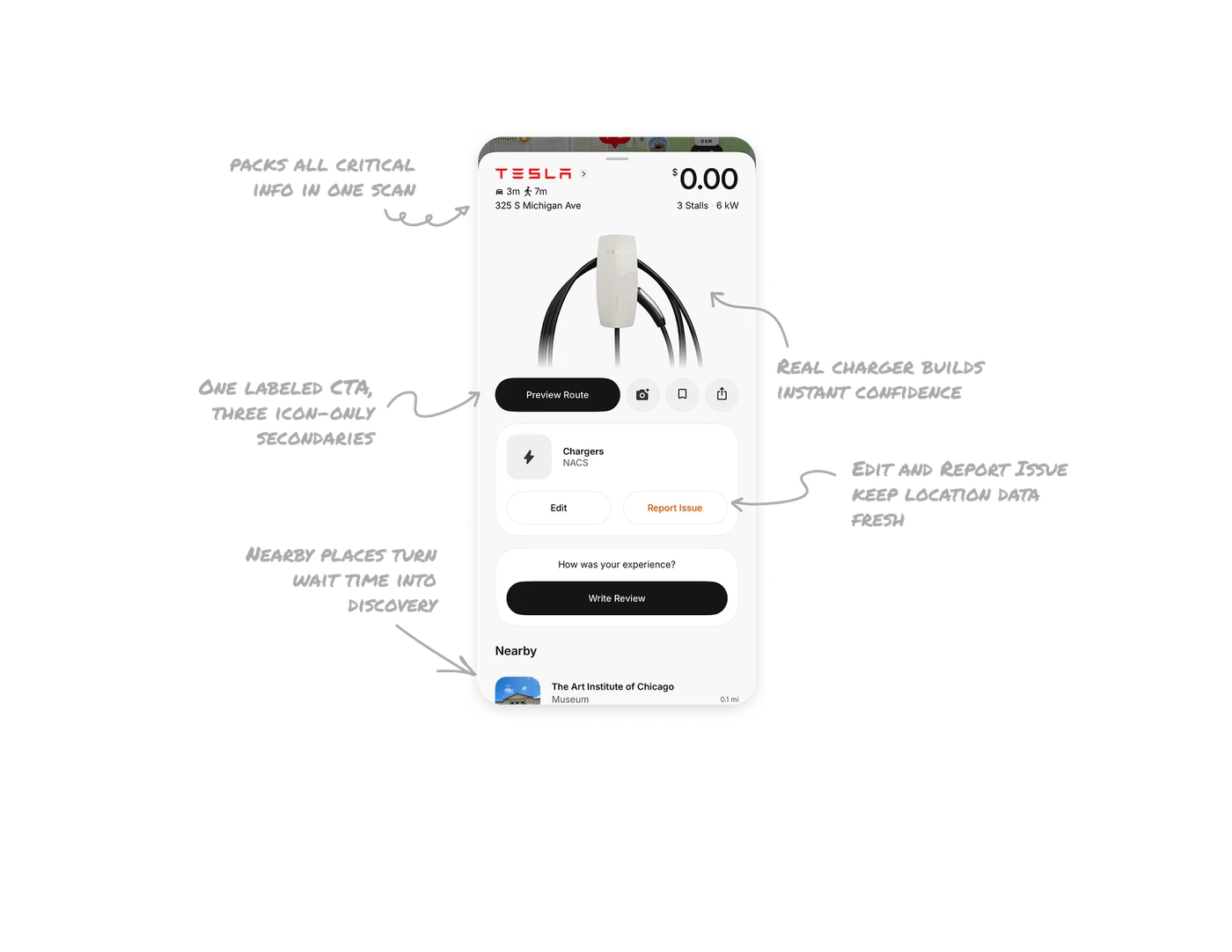Preview Route is full-width, black, and labeled. Camera, bookmark, and share are small gray icon circles with no labels. The visual weight difference means users never hesitate on what to do next. Secondary actions are present for power users but invisible to anyone focused on the primary task of navigating to the charger.