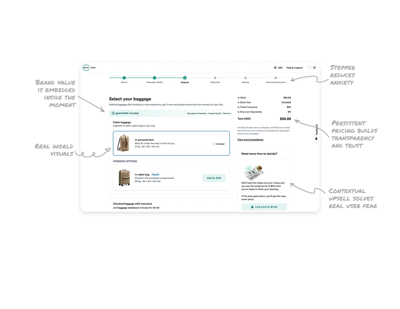 The Guarantee included banner is placed directly inside the baggage selection area. Instead of promoting brand value on a separate marketing page, it appears exactly where trust matters most. This reinforces differentiation at the moment of financial commitment.
