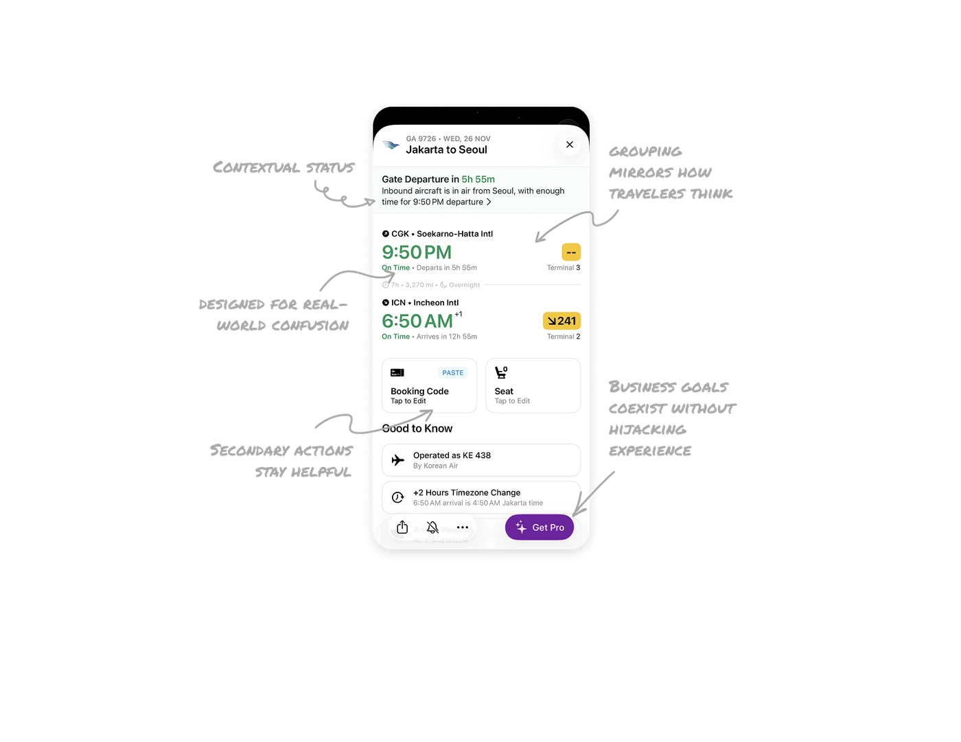 The Get Pro CTA stays sticky at the bottom, visible but visually detached from flight data. It keeps monetization present while avoiding disruption, a strong example of conversion without coercion.