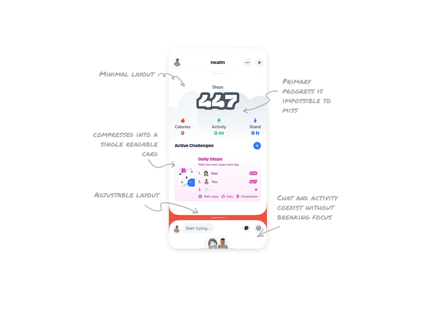 Clear screen partitions allow users to minimize or expand sections based on intent. This flexibility lets users shift between tracking and social interaction without friction.