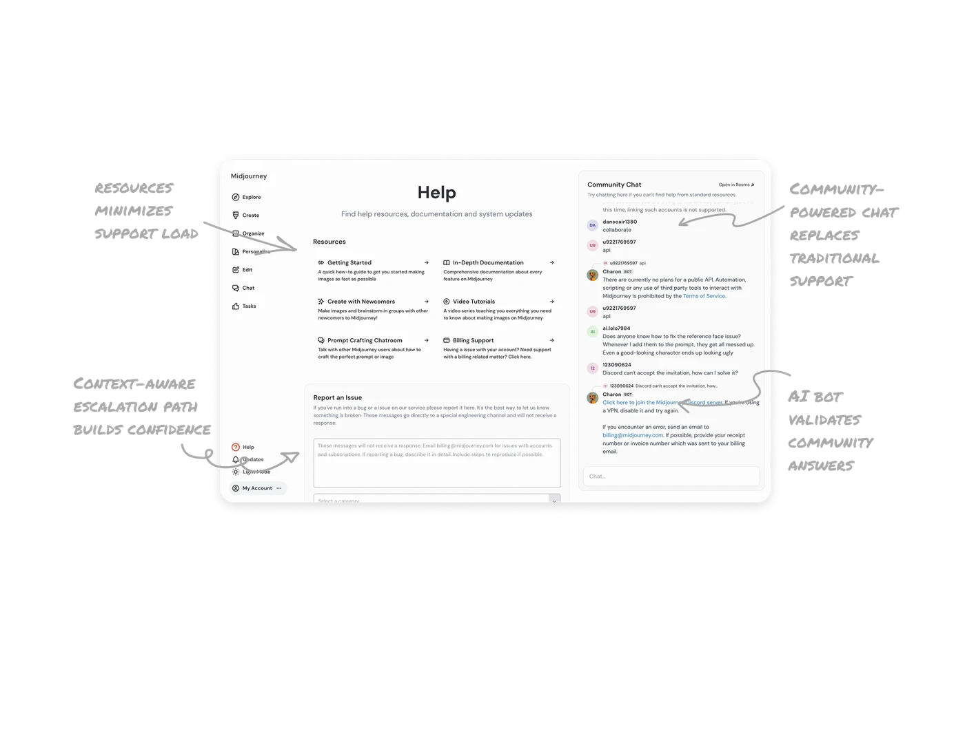 Instead of relying on costly support staff, Midjourney integrates a community chat. Users can share questions and receive peer responses, creating a self-sustaining ecosystem of shared learning.