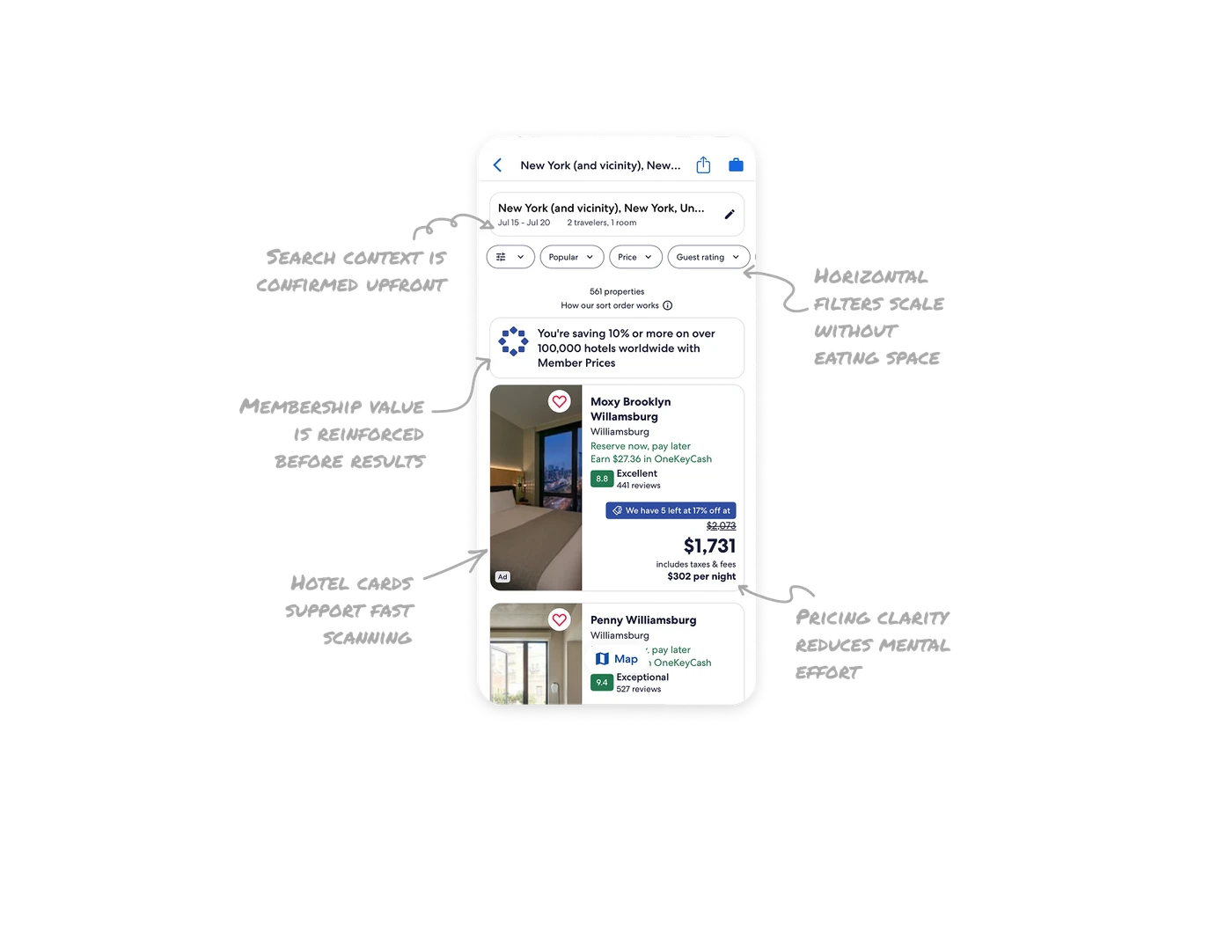 Before showing hotels, Expedia highlights how membership saves money. This keeps the benefit top of mind and frames the results as already optimized for value.