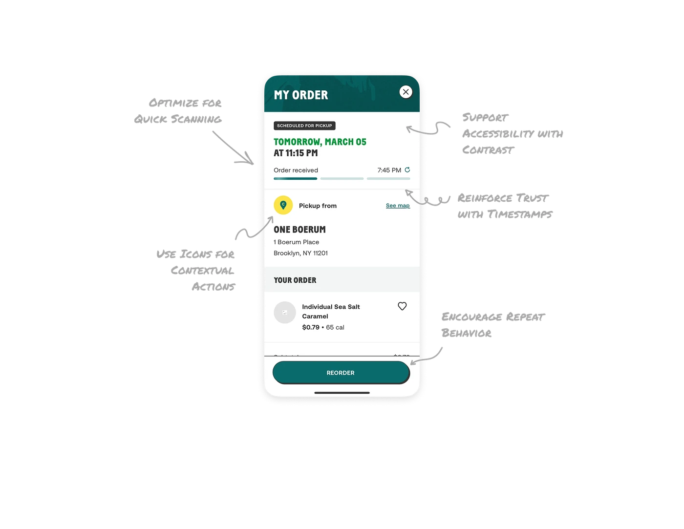 High contrast between the green pickup time, black text, and white background ensures readability for visually impaired users, a vital accessibility practice that applies to all interfaces, especially for elderly audiences.