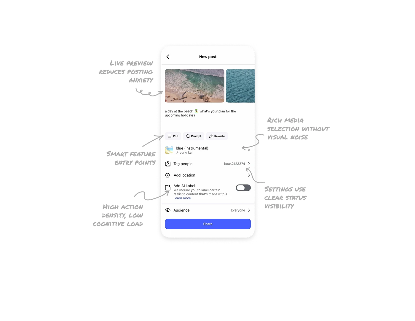 This screen handles caption editing, media preview, music, tagging, location, AI disclosure, audience, and more. Strong hierarchy, spacing, and consistent row patterns keep it feeling calm and scannable despite the complexity.