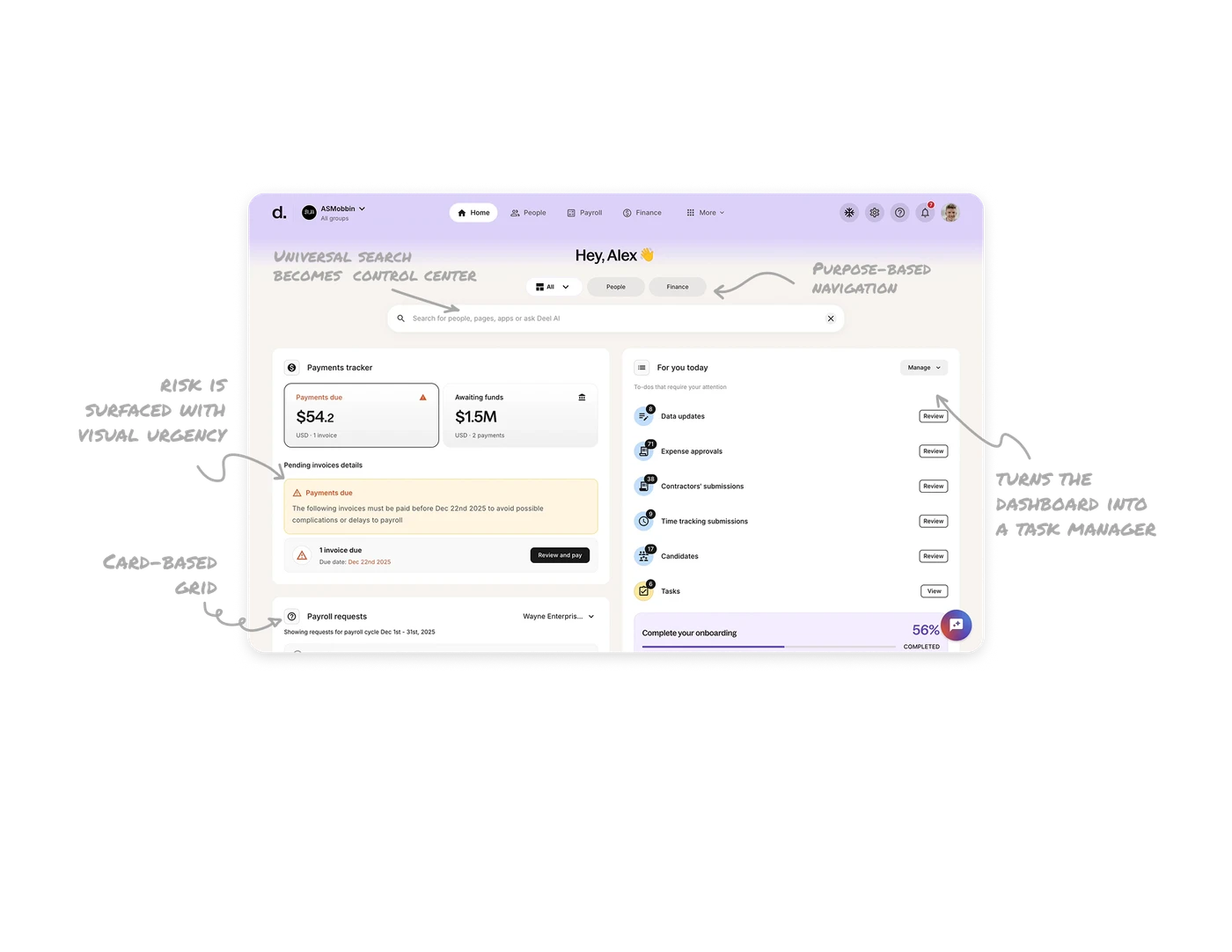 The centered search bar is visually dominant and always accessible. On an information-heavy platform like Deel, search is not a utility. It is the fastest path to action. Also with AI being embedded directly into search turns it into an intelligent assistant rather than a basic lookup tool.