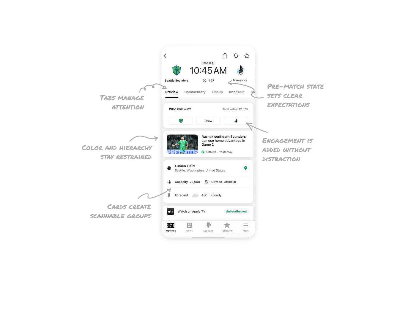 The interface relies mainly on white space, black text, and gray tones, with color used only where it adds meaning, like team identity. This reduces visual noise and improves reading speed.