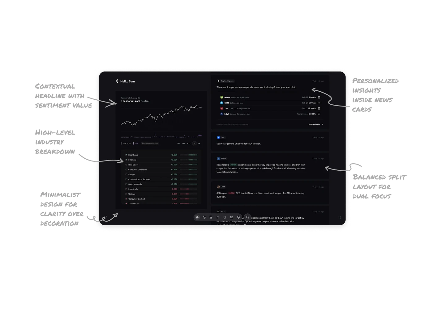 Instead of a generic greeting, the headline tells users the market sentiment right away. Neutral sentiment is displayed with a neutral tone, while bullish and bearish states use green and red for instant recognition.