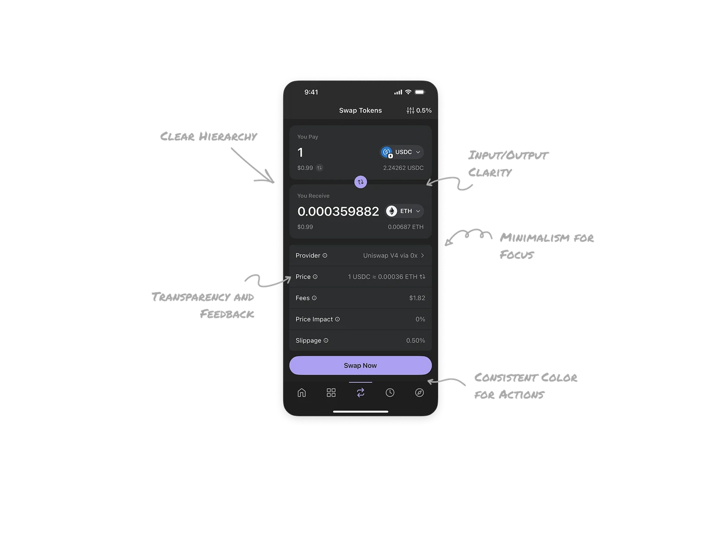 The “Swap Now” button, as the primary action, is anchored at the bottom, making it easy to reach with the thumb and encouraging quick, effortless interaction.