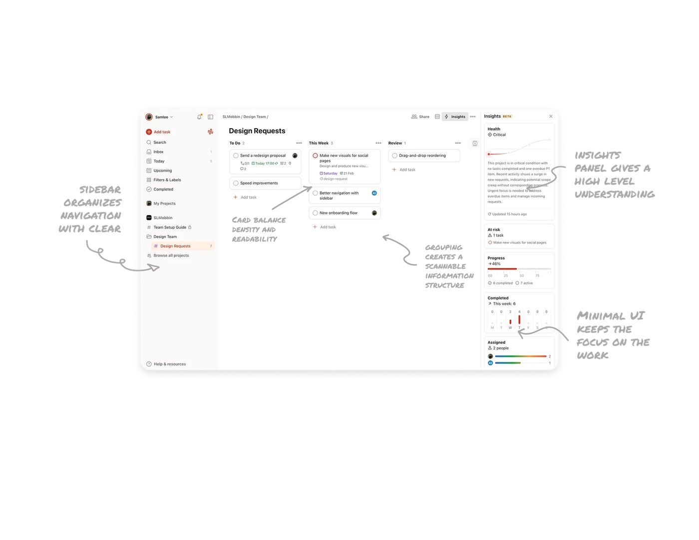 The Insights panel on the right provides analytics about project health, progress, and completed tasks. Instead of forcing users to analyze every task manually, the dashboard summarizes key signals. Visual indicators such as progress bars, activity graphs, and risk warnings help users quickly understand the state of the project and decide where attention is needed.