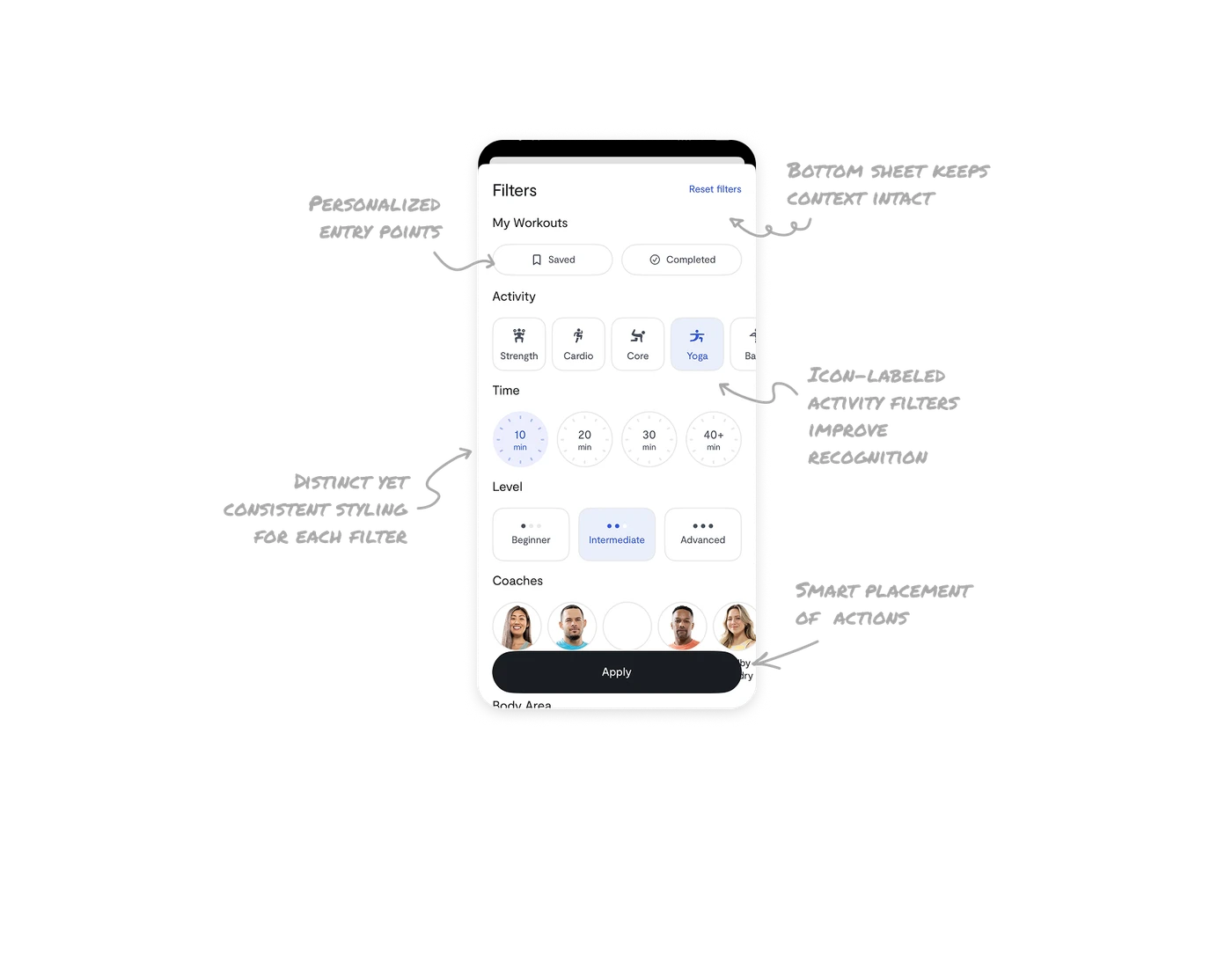 The Reset option sits at the top right since it’s less frequent, while the Apply button anchors at the bottom, large, centered, and thumb-friendly. This hierarchy aligns with real usage patterns.